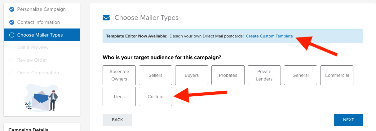 2. Creating a Direct Mail Campaign. As you create the campaign you will be able to Create a Custom Template on the ‘Choose Mailer Typers’ step of the campaign set up process.