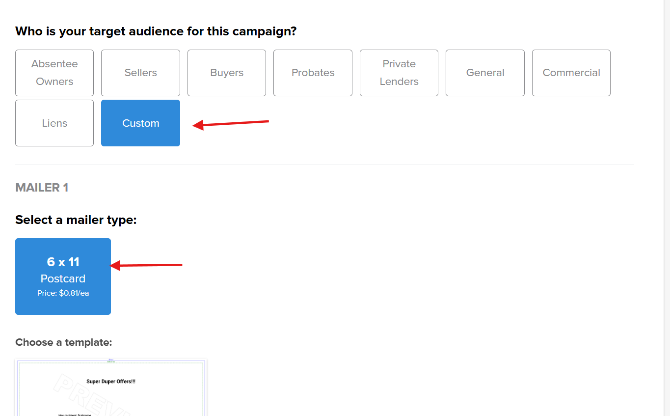 - Please Note: If the Postcard has already been created, you will be able to select it. It will be found in the ‘CUSTOM’ option when selecting the 'Target Audience' for the campaign